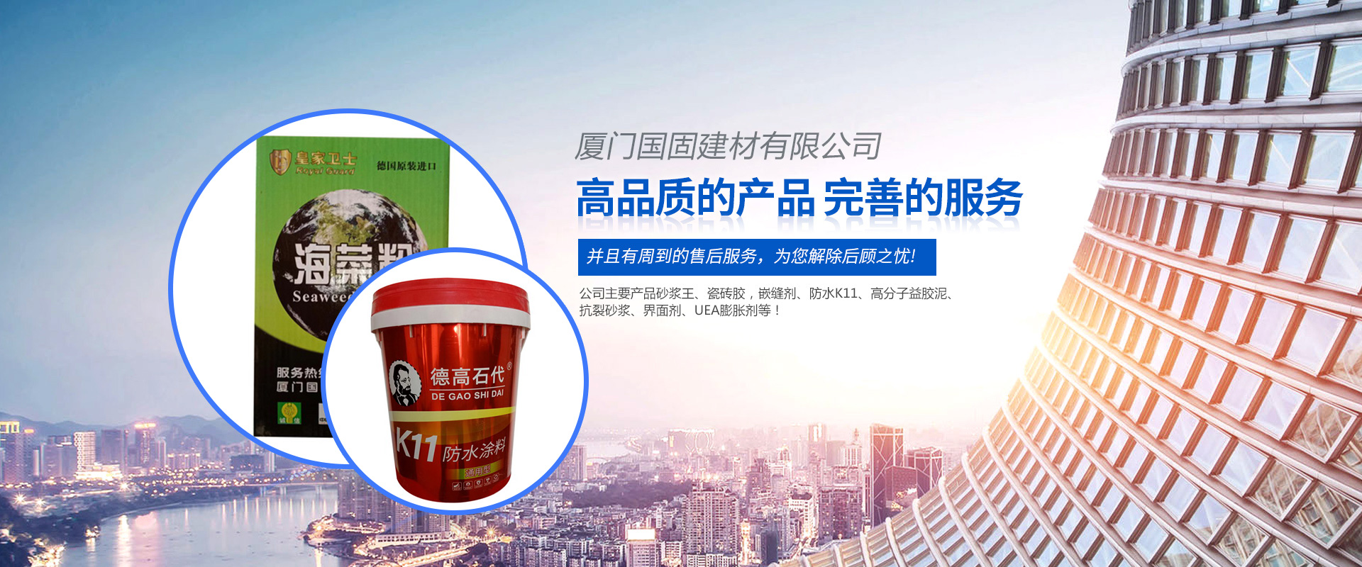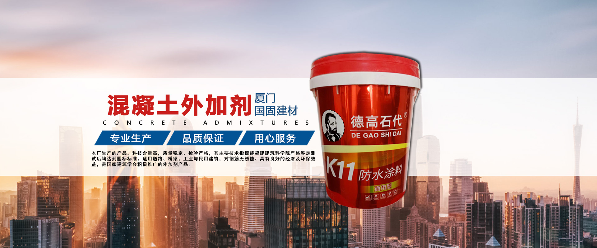 ??廈門(mén)國(guó)固建材有限公司是集科研開(kāi)發(fā),生產(chǎn)為一體的混凝土外加劑科技生產(chǎn)單位,公司技術(shù)力量雄厚,工藝科學(xué)先進(jìn),產(chǎn)品質(zhì)量及性能在全國(guó)同行業(yè)中。并且有周到的售后服務(wù),為您解除后顧之憂(yōu)。本廠生產(chǎn)的產(chǎn)品,科技含量高,質(zhì)量穩(wěn)定,檢驗(yàn)嚴(yán)格,其主要技術(shù)指標(biāo)經(jīng)福建建筑科學(xué)院嚴(yán)格鑒定測(cè)試后均達(dá)到國(guó)標(biāo)標(biāo)準(zhǔn)。是目前水泥制品中理想的名加劑產(chǎn)品,適用道路、橋梁、工業(yè)與民用建筑,對(duì)鋼筋無(wú)繡蝕、具有良好的經(jīng)濟(jì)及環(huán)保效益,是國(guó)家建筑學(xué)會(huì)積極推廣的外加劑產(chǎn)品。本廠推廣標(biāo)準(zhǔn)化,規(guī)范化、程序化管理、具有健全、完善、持續(xù)穩(wěn)定運(yùn)行的質(zhì)量保證體系。產(chǎn)品遠(yuǎn)銷(xiāo)上海、江蘇、浙江、廣州、北京、江西、安徽、福建等地,在大批國(guó)家建設(shè)工程中應(yīng)用效果良好,并以性能優(yōu)越、質(zhì)量可靠、以及良好的售后服務(wù)在市場(chǎng)上享有很高的信譽(yù)。本廠在今后的歷程中,將一如既往的為您提供高質(zhì)量、高科技的產(chǎn)品,完善的服務(wù)以感謝廣大客戶(hù)的支持和厚愛(ài)。“科技創(chuàng)新、以誠(chéng)為本,用戶(hù)滿(mǎn)意”是我公司發(fā)展的永恒目標(biāo),我們堅(jiān)持“以誠(chéng)結(jié)情、質(zhì)量取勝”,以高品質(zhì)的產(chǎn)品回報(bào)社會(huì)。“用科興建材,創(chuàng)優(yōu)品工程”,期待與各界朋友與時(shí)俱進(jìn),努力開(kāi)拓進(jìn)取,力求為用戶(hù)提供“高品質(zhì)的產(chǎn)品,完善的服務(wù)”。公司愿與設(shè)計(jì)部門(mén)、建設(shè)單位、施工企業(yè)及同行們攜手合作,共創(chuàng)未來(lái),共鑄輝煌、公司主要產(chǎn)品砂漿王、瓷磚膠,嵌縫劑、防水K11、高分子益膠泥、抗裂砂漿、界面劑、UEA膨脹劑等!
